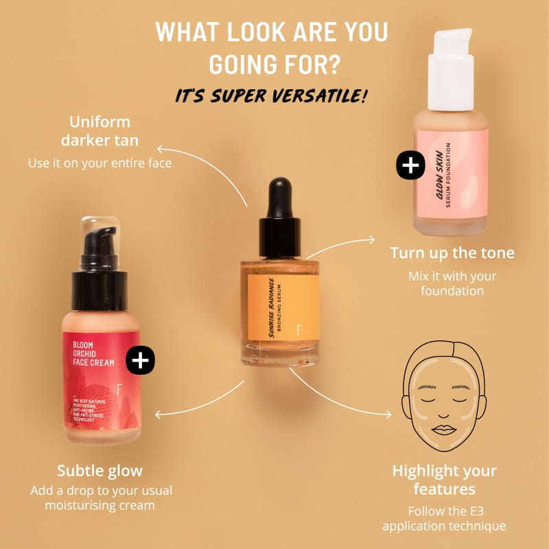 If you are also applying foundation, you can mix the two products together on the back of your hand and then apply to your face for an even, luminous finish. You can also dab the Sunrise Radiance Bronzing Serum on after foundation - it's super versatile!