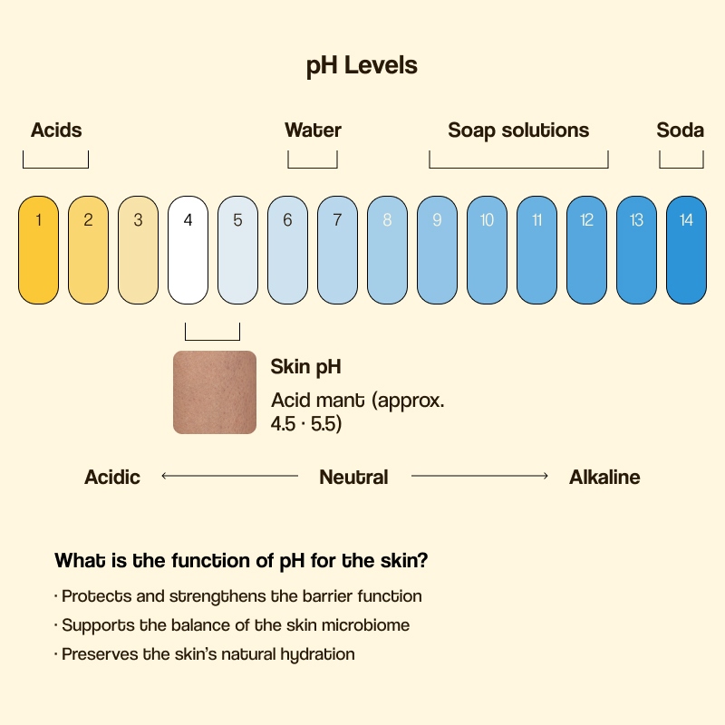 The skin's acid mantle is the barrier that helps preserve essential lipids and maintains a healthy microbiome. pH refers to the level of acidity or alkalinity, and its scale ranges from 0 to 14, with 7 being neutral. If the levels are below 7, it is considered acidic, and if above 7, alkaline. The skin has a slightly acidic pH, between 4.5 and 5.5, to maintain its integrity and healthy function.