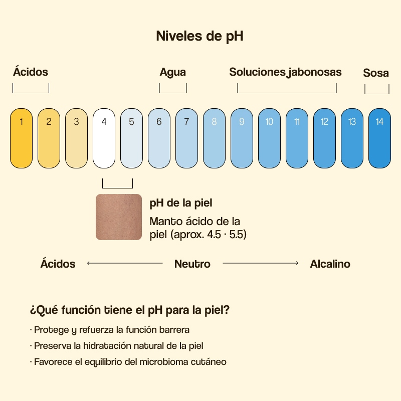 El manto ácido de la piel es la barrera que ayuda a preservar los lípidos esenciales y sustenta un microbioma saludable. El pH se refiere al nivel de acidez o alcalinidad, y su escala varía de 0 a 14, siendo 7 el nivel neutro. Si los niveles están por debajo de 7 se considera ácido y por encima, alcalino. Dicho esto, la piel tiene un pH ligeramente ácido, entre 4.5 y 5.5, para mantener la integridad y función saludable de la piel.