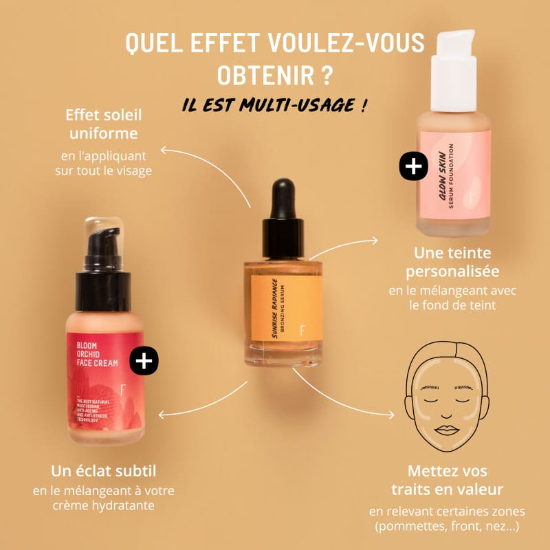Le Sunrise Drops Serum n'est pas un autobronzant, mais plutôt un produit de maquillage qui donne à votre visage un effet bronzant naturel et lumineux. Vous pouvez donc le démaquiller parfaitement et le réappliquer quand vous voulez pour afficher un visage bronzé et lumineux.