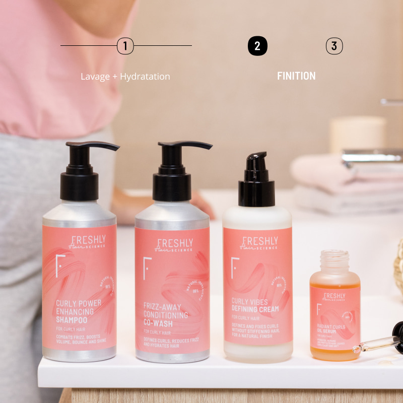 La Curly Vibes est une crème qui définit les boucles, tandis que Radiant Curls est une huile qui nourrit et fait briller les cheveux bouclés. Pour profiter de tous leurs avantages, appliquez 2 à 3 pompes de la crème définissante votre main sur cheveux humides, après le lavage. Frottez-la entre les paumes de vos mains et massez vos boucles avec vos doigts. Ensuite, appliquez 1 ou 2 gouttes de Radiant Curls Oil Serum, et répartissez-le sur vos cheveux, de la mi-longueur aux pointes, sans atteindre les racines, et laissez vos cheveux sécher à l'air libre ou séchez-les doucement avec un diffuseur. À vous de jouer !