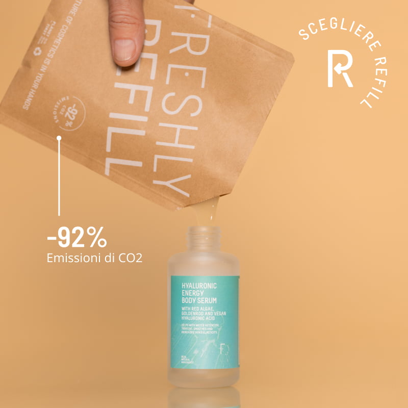 Anche tu credi in un futuro migliore? Allora il formato Refill è quello che fa per te! Scegliendo questa opzione, ci aiuterai a ridurre le emissioni di CO2 del 92%. Inoltre, è riciclabile al 100%! Grazie a voi, continuiamo a investire nell'innovazione con amore. Per il corpo, per l'ambiente, per il futuro: ricarica i tuoi Freshly all'infinito senza uscire di casa!