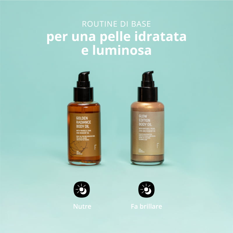 Il pack must-have per gli amanti dell'olio per il corpo! L'olio per il corpo 100% naturale bestseller di Freshly, e la sua edizione Glow, ti accompagnano per sfoggiare una pelle liscia, radiante e luminosa ogni volta che vorrai. I suoi 12 oli vegetali e tecnologie naturali nutrono le tue cellule cutanee per un aspetto visibilmente più sano, mentre migliorano l'aspetto di smagliature e cicatrici, con la versione glow potrai brillare grazie alle miche minerali. *Adatto solo per le pelli più golose.