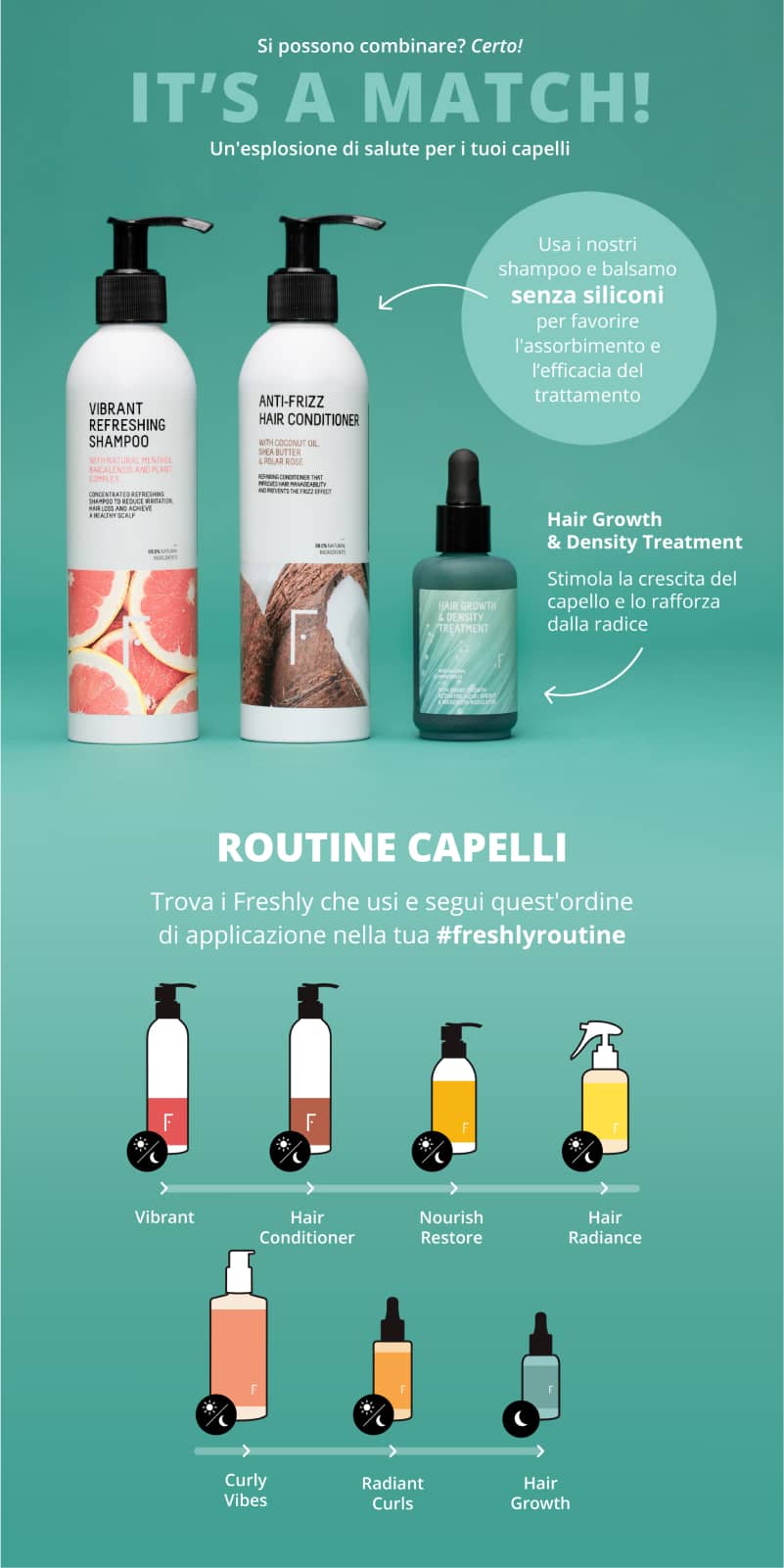 ¡TIP! Per ottenere i migliori risultati dal trattamento, integra nella tua routine per capelli prodotti con ingredienti naturali, senza solfati e senza siliconi. Cerca la tua routine Freshly!